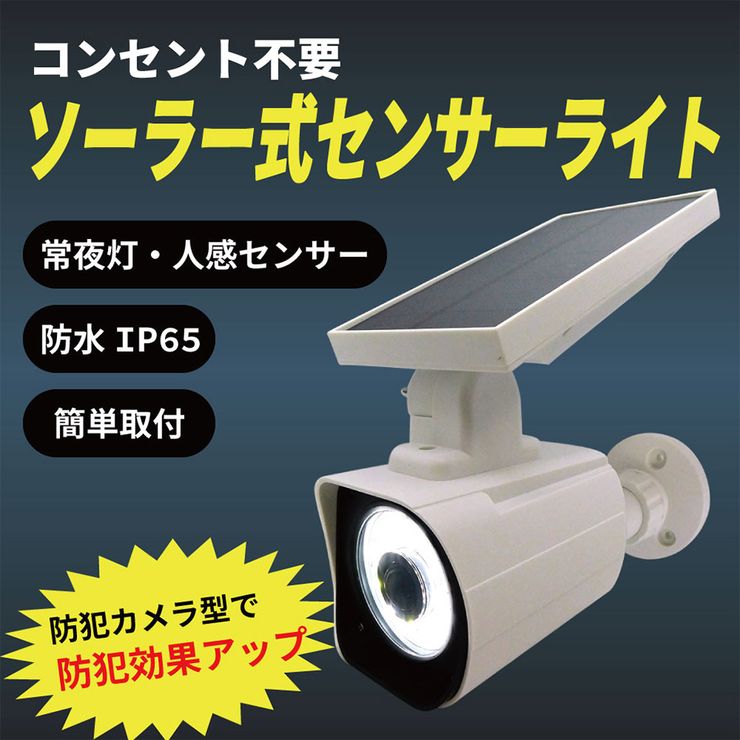 商品名 ソーラー式センサーライト/防犯カメラ形状タイプ 商品情報 ・防犯カメラ形状のLEDライトで防犯効果大 ライトのデザインを防犯カメラすることで、見た目で防犯対策ができます。