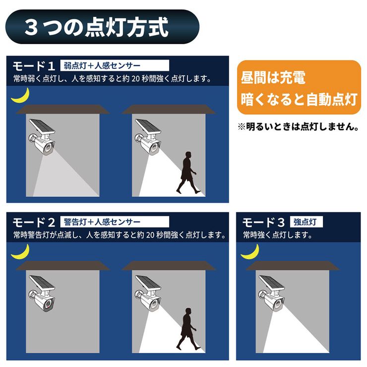 ・選べる3つのモードでLED点灯 モード1 … 暗い環境で弱点灯、人を検知して約20秒 強点灯 モード2 … 暗い環境で消灯、人を検知して約20秒 強点灯 モード3 … 暗い環境で強点灯、約4時間後に弱点灯に変わります。