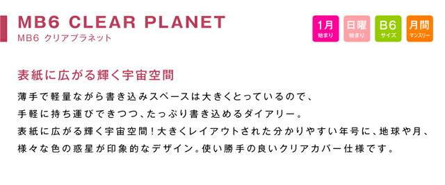 使い勝手の良い透明カバーに、大きく年号をあしらった人気のプラネットシリーズデザインの手帳。